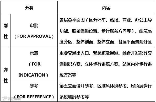 为支撑区域建设,港铁公司委托多家专业设计单位组成联合体(包括MAUNSELL-建设组织;AECOM-规划设计;AEDAS-建筑设计; MEINHAROT-机电工程顾问;MVA-交通规划;VURO HAPPOLD-结构设计;EDAW-景观设计;MOTT-工程顾问)编制了西九龙交通枢纽地区总体设计方案,并于2009年11月通过了香港规划署审定。该规划达到了类似修建性详细规划的深度,并采用“文本+图则”的表达形式,成果由审批(FOR APPROVAL)、示意(FOR INDICATION)、参考(FOR REFERENCE)三部分组成,体现了刚性、弹性相结合的规划管控思路。