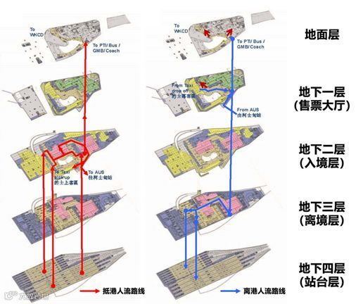 西九龙站抵港及离港人流组织路线示意图