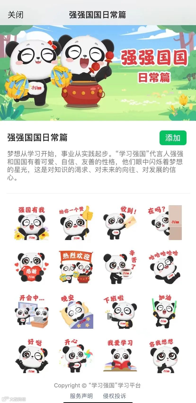 梦想从学习开始,事业从实践起步。“学习强国”代言人“强强”和“国国”有着可爱、自信、友善的性格,他们眼中闪烁着梦想的星光,这是对知识的渴求、对未来的向往、对发展的信心。“学习强国”学习平台隆重推出“强强国国日常篇”微信表情包,欢迎广大读者在微信中下载使用。