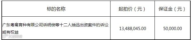 受广东粤禽育种有限公司管理人(下称委托人)委托,我司于2023年9月28日10时在中拍平台(https://paimai.caa123.org.cn)以网络拍卖方式举行广东粤禽育种有限公司诉胡俊等十二人抽逃出资案件的诉讼或有权益拍卖会,现公告如下: