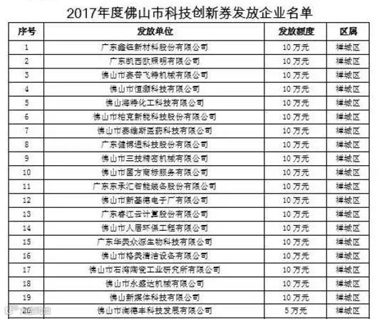 2017年度,佛山市科技创新券发放企业455家,额度主要有10万元、5万元两种