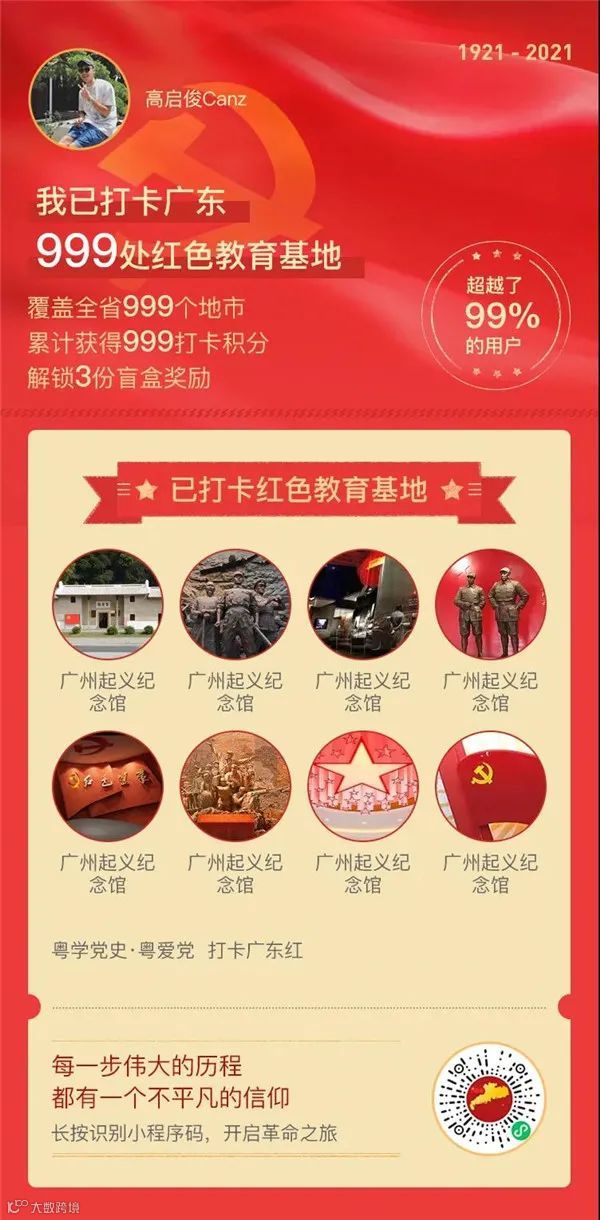 在“打卡广东红”小程序,你不仅可以回顾历史、缅怀先烈、展望未来,还可以通过分享自身喜欢的红色地标获取积分,抽取盲盒。在收获知识的同时,还将有机会收获一份献礼建党百年的珍贵纪念!