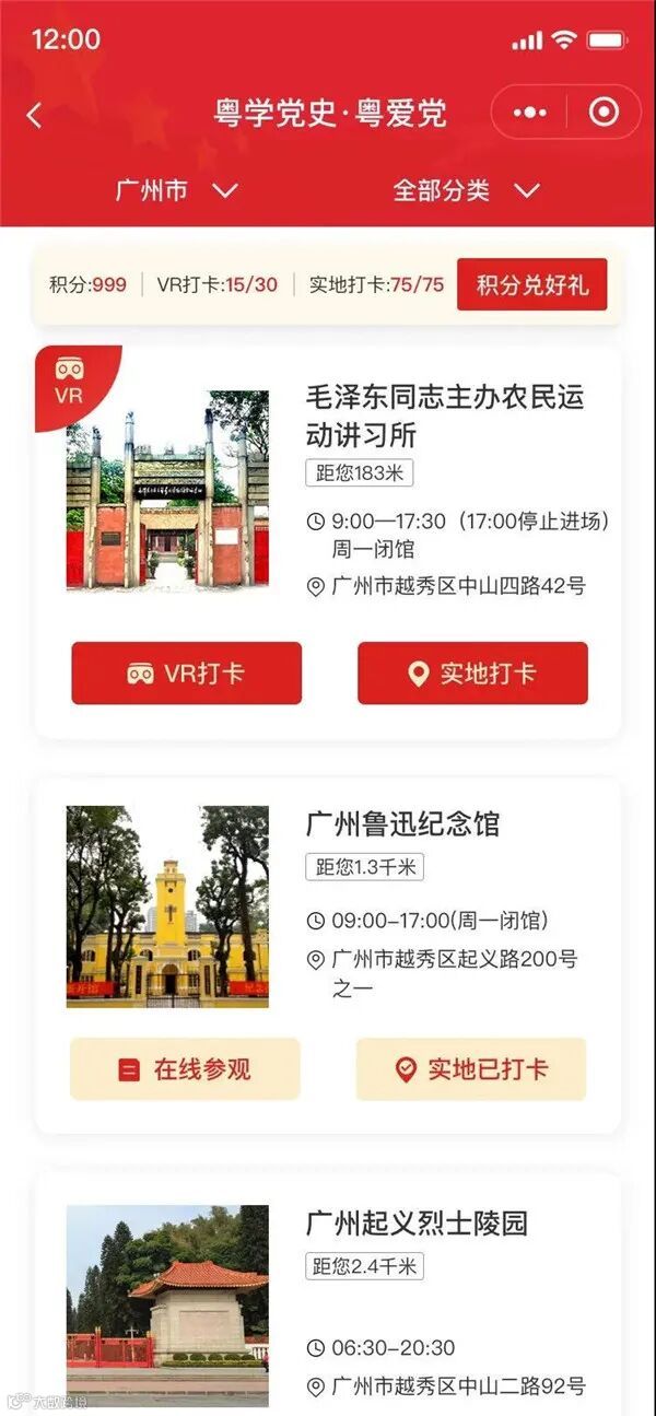 “粤学党史·粤爱党——打卡广东红”小程序充分利用广东先进科技优势,联合国内互联网头部平台,将VR、AI、LBS等前沿技术和语音导览、全景直播、视频展播、真人讲解、图片文字等手段进行全方位、多维度聚合展示,让用户真实感受“指尖轻触、码上云游”的先进科技体验感。