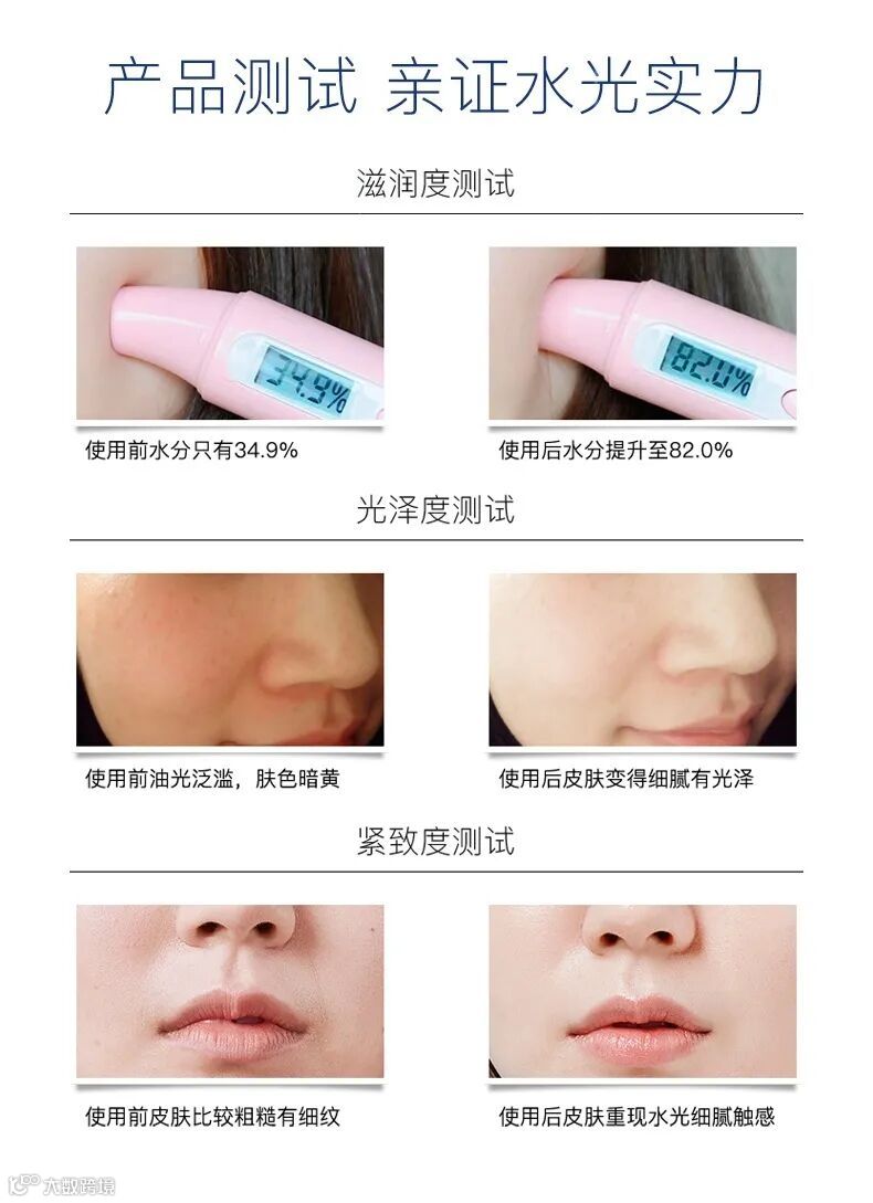1. 涂抹前请拍打足量爽肤水,因为玻尿酸原液会在段时间内大量吸收水分,在肌肤表面形成一道水合保护膜,如此时肌肤缺水,可能会产生搓泥现象。