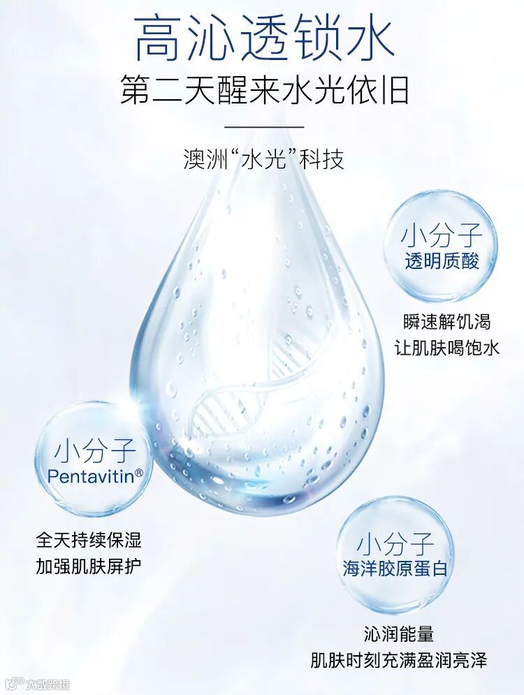 含有被誉为“上帝的两滴泪”的微分子团化活性玻尿酸和胶原蛋白:更容易被肌肤有效吸收,滋润皮肤、时光逆转,能达到几乎与注射型水光针媲美的效果。