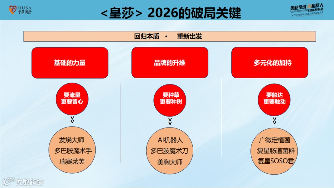 第一驾马车“皇莎科技康养项目”,是集团发展的坚实根基。依托20余年深耕美业的经验积淀,皇莎科技康养品项已形成成熟体系,为千万客户提供专业、优质的康养服务,成为集团稳步前行的核心支撑。第二驾马车“AI智能”,是集团决胜未来的关键布局。顺应美业智能化趋势,皇莎全力推进AI技术与服务场景的深度融合,以技术创新打破传统服务瓶颈。第三驾马车“复星大健康肠道菌群千亿市场布局”,是集团抢占当下蓝海的盈利引擎。精准把握大健康产业发展风口,皇莎携手复星布局肠道菌群市场,为客户提供多元化健康服务的同时,为门店注入新的盈利增长点。