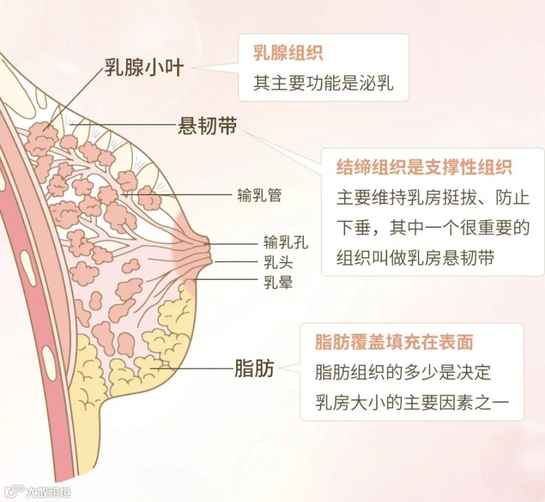 而乳房悬韧带的松弛老化,更多是因为随着年龄的增长,弹力蛋白和胶原蛋白逐渐流失,导致乳房悬韧带弹性下降、拉长、支撑力减弱。