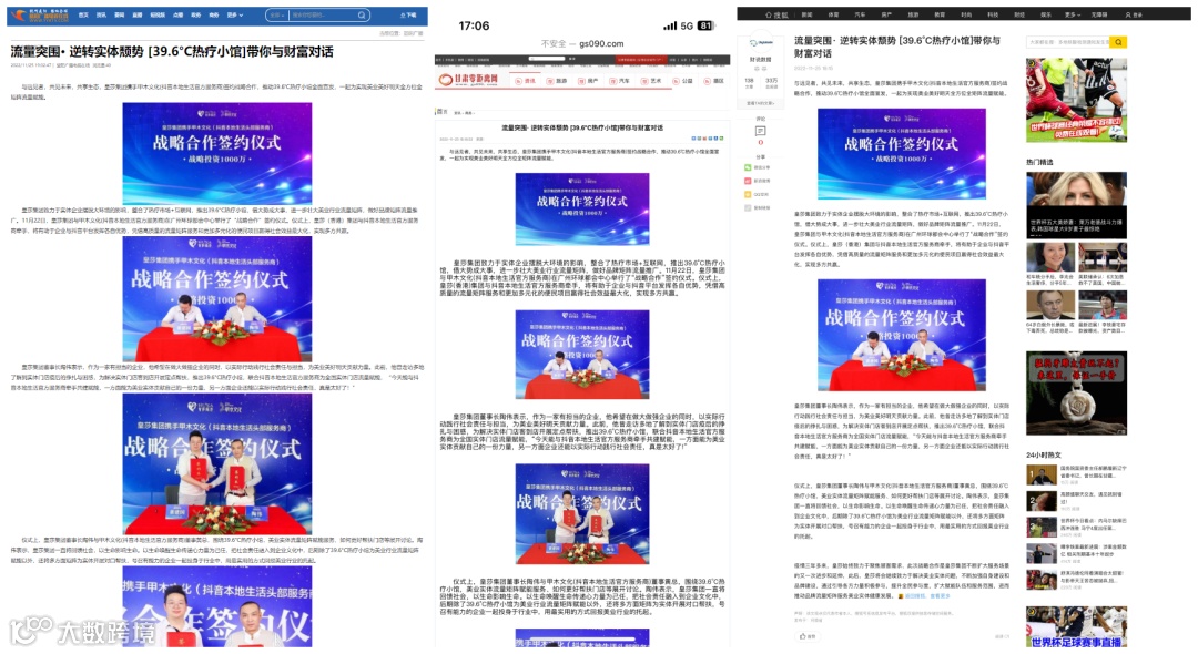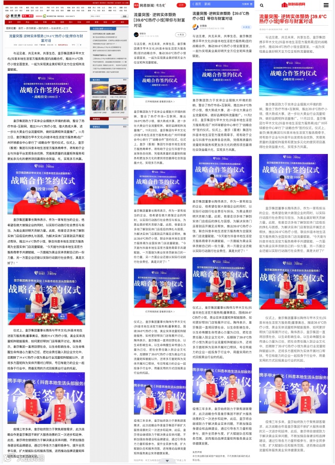 与远见者,共见未来,共享生态,皇莎集团携手甲木文化(抖音本地生活头部服务商)达成战略合作,[39.6℃热疗小馆]引发中华新闻、凤凰网、搜狐网、腾讯新闻、网易新闻、海峡网等多家媒体竞相推广,火爆全网,成为逆转美业实体颓势的火爆大势。