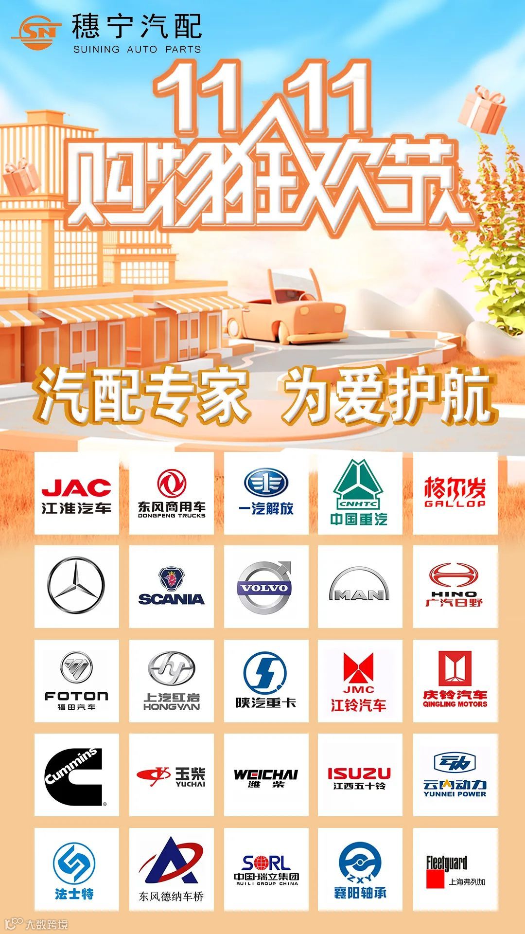 穗宁携手江淮汽车、东风商用、一汽解放、中国重汽、福田汽车、玉柴机器、康明斯(中国)、江西五十铃、潍柴动力、法士特、一汽锡柴、云内动力、东风德纳车桥、玉柴马石油、襄阳轴承、瑞立集团、铁流离合器、三环集团、万安科技等一系列商用车、发动机、变速箱和知名零部件厂家倾情巨献,活动期间,全场买一送一,史无前例最大让利,倾情回馈用户,并赠送积分好礼,惊喜多多,福利多多,汽配专家,为爱护航!