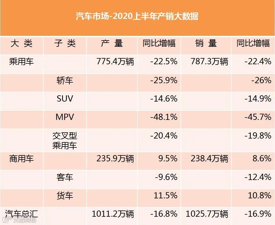 7月10日,中国汽车工业协会发布2020年上半年汽车产销数据,数据显示,2020年1-6月,