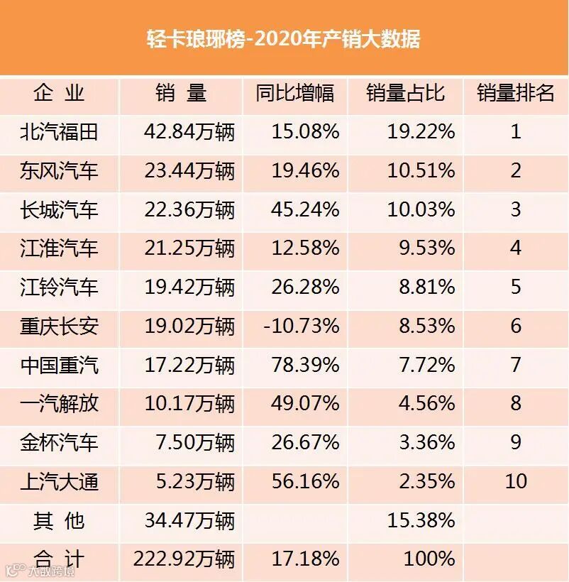 众所周知,轻卡历来是货车中最大的细分市场,地位举足轻重。2020年全年,轻卡累计销量达222.92万辆,同比增长17.18%,无论是销量还是增速,都是近年最高的,刷新了记录,大疫之年,轻卡能“考出”如此耀眼的成绩,实属不易!