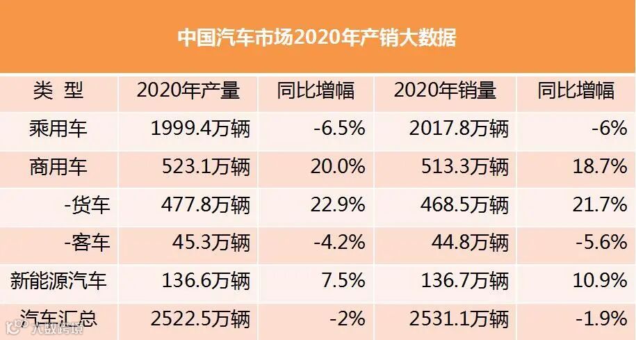 2020年,突如其来的新冠肺炎疫情为汽车行业按下了“暂停键”,在巨大的冲击下,全行业同舟共济,不畏艰难,坚决落实党中央、国务院的决策部署,扎实推进复工复产,加快转变营销方式,积极促进汽车消费,汽车市场逐步复苏,全年产销增速稳中略降,基本消除了疫情的影响,汽车行业总体表现出了强大的发展韧性和内生动力。全年汽车产销分别完成2522.5万辆和2531.1万辆,同比分别下降2%和1.9%,降幅比上年分别收窄5.5和6.3个百分点。