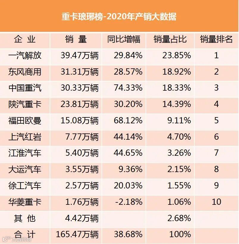 此外,重卡企业转战轻卡成效卓著,成为最具威胁的新势力。且不说一汽在轻卡领域10万辆的成绩,仅用8年时间就做到了。就以2020年轻卡市场最耀眼的重汽为例,尽管排名仍是第七位,但是它与长安的差距仅余万辆,距离老牌轻卡企业江淮、江铃也不过两三万辆的差距。重汽和一汽用实际的成绩证明,大汽车集团能干好轻卡,而且可以干得非常好。