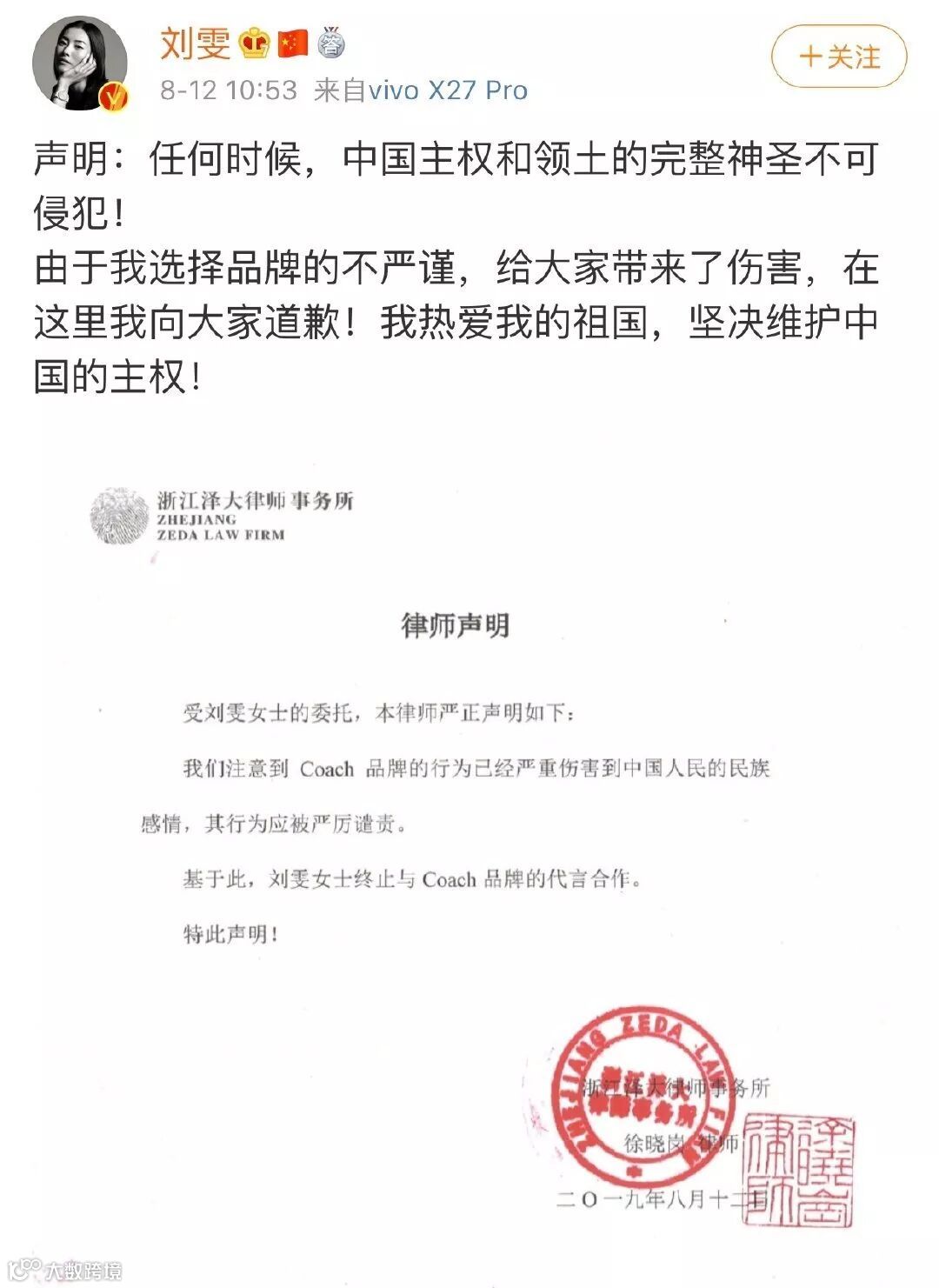 她不仅亲自在微博上为自己选择品牌的不谨慎而向大家道歉,并且在蔻驰被爆出侵权时,外界还在各种猜测刘雯怎么没像杨幂那样迅速地作出回应与品牌划清界限,但其实刘雯在国内没有经纪人,所以面对这样的情况她应该也是手足无措的,她只能自己委托律师方来表明自己的立场。