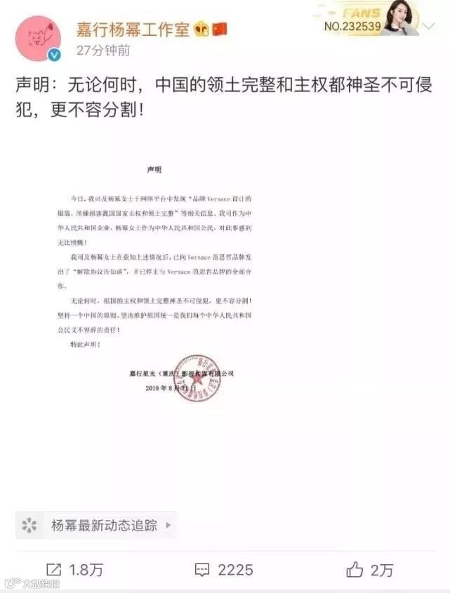 在外网为发任何道歉声明的时候,范思哲首位中国代言人杨幂立即发表了与其终止所有合作的声明。