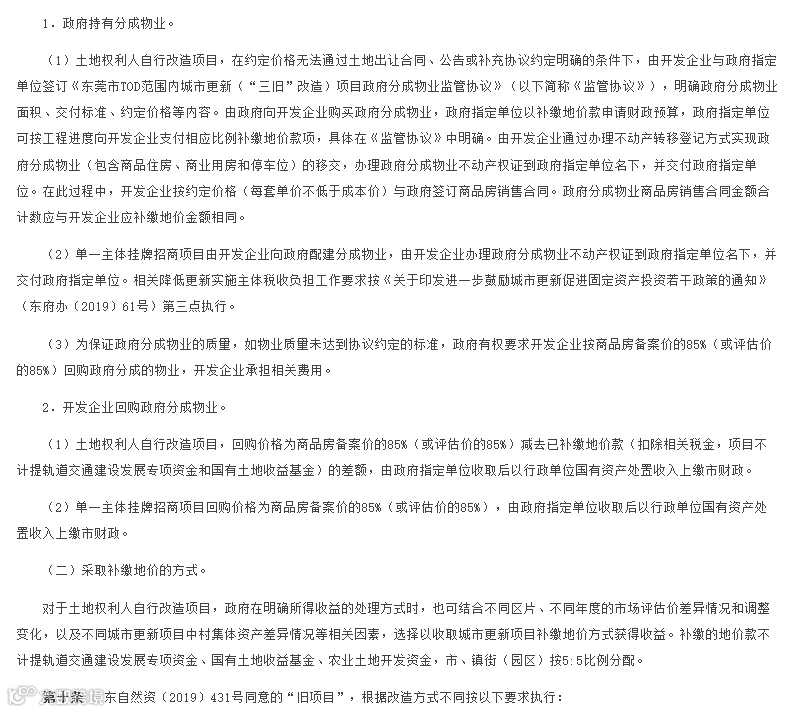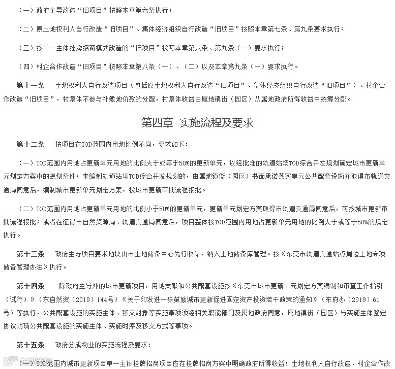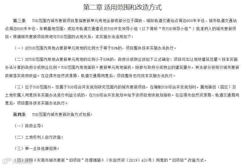 第二部分“适用范围和改造方式”阐述了《实施办法》的适用范围,以及政府主导、土地权利人自行改造、单一主体挂牌招商和“旧项目”四种改造方式;