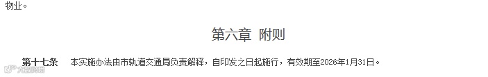 第六部分“附则”阐述了《实施办法》由轨道交通局负责解释及《实施办法》的有效期。