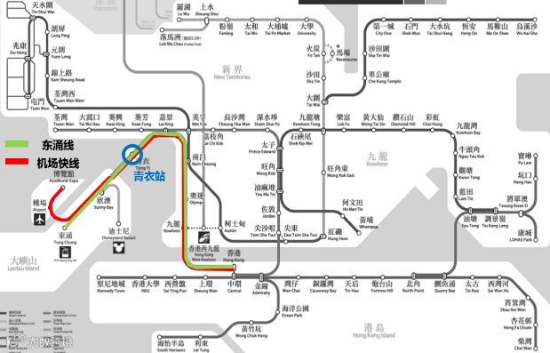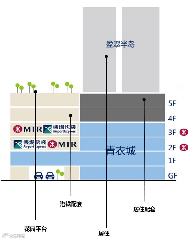 青衣站的开发是香港“轨道+物业”模式的代表项目之一。青衣站位于港岛西部,是东涌线与机场线换乘的主要站点。港铁公司联同长江实业、和记黄埔、中信泰富等地产发展商,发展车站上盖商场及物业,占地约5.4公顷,开发量约29万平方米,1999年正式运行。业态以商业和居住为主,其中居住占84%,商业占16%。主要的住宅开发为盈翠半岛的12栋住宅楼,约3500户住宅单元。