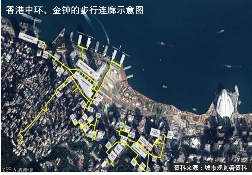 香港强调综合性的土地开发,地铁一体化设计重新塑造和组织室内化的公共空间环境,让公众步行就可解决日常的工作和生活问题,尤其是在地铁上盖和附近的居民社区、市中心区的建筑物都有较为完善的步行系统。目前,香港市区有超过900座步行天桥和隧道(Ⅴ)。在TOD的策略下,香港政府建设舒适和安全的步行道连接公交站点,在九龙旺角地铁站、中环、湾仔等区域都有封闭且成体系的步行走廊。举例来说,中环的步行连廊约2.8km,连接了22座建筑物,金钟的步行连廊约1.6km,连接了21座建筑物。