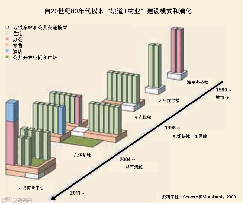 从整体上来看,香港TOD模式经历了早中晚三个时期,“轨道+物业”模式为其主体开发形式,港铁公司作为香港TOD开发的“总规划师和设计师”,制定了平台开发计划,解决所有和地铁站点的交接问题,处理拍卖的地块,担当政府与开发商之间的联络员,并监督开发质量和完工物业的出售情况。20世纪90年代以来,“轨道+物业”的开发原则发生了变化,新的开发项目实施以公共交通导向的开发设计概念,土地价值捕获的方式从有限土地上的小型简易塔楼获取补贴,转向了大规模且用途复杂地块的可持续融资和城市化,这对公共交通的乘客量提升和整个车站服区的物业价格溢价带来了更大的协同效益(Ⅱ)。