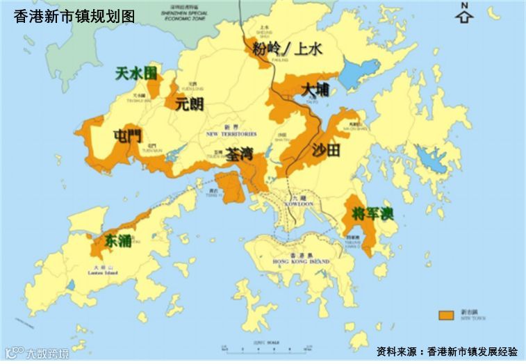 1970年代,随着香港经济繁荣和人口的增长,政府规划了九个新市镇疏解中心城区的人口。地铁和公屋是引导人口向新市镇疏解的重要支撑。经历了三代的新市镇发展,如今9个新市镇的整体人口约327万,约占香港740万总人口的44%。从整体来看,香港新市镇的规划开发体现出以下的特点: 首先,对车站周边地块进行高强度开发,新近建成的机场铁路、将军澳支线的车站地区物业开发容积率都在5以上。其次,局部地区实现居住和就业之间的平衡。如港岛北城市发展带面积22.5km2,居住人口94.7万人,就业岗位71.2万人,2/3的就业人口居住其中。最后,创造良好的步行环境和公共空间,绝大多数办公建筑到地铁站的距离是200m左右,通过天桥和地下步道的精心设计,减少步行距离感。