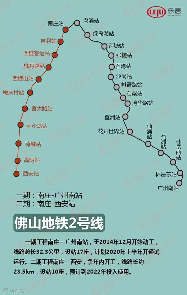 地铁2号线一期工程线路全长32.41km,途经南庄、石湾、佛陈路、文登路等至广州南站,共设车站17座,其中换乘站10座,是广佛之间的第二条城际通道,预计2019年底试运行。