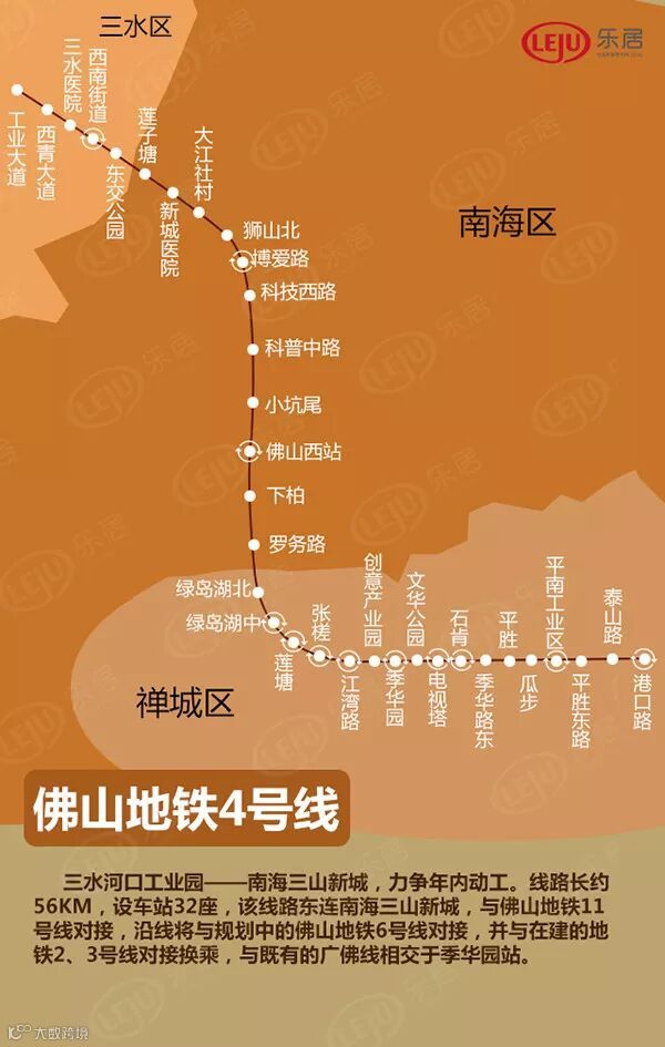 佛山地铁4号线一期计划起于三水区工业大道站,止于南海港口路站,线路长约56公里,其中三水段长约7.1公里。该段全线设车站33座,其中三水段共有5个站点,分别为:工业大道、西青大道、三水医院、西南街道和东交公园。按照计划,地铁4号线将于今年底动工建设。