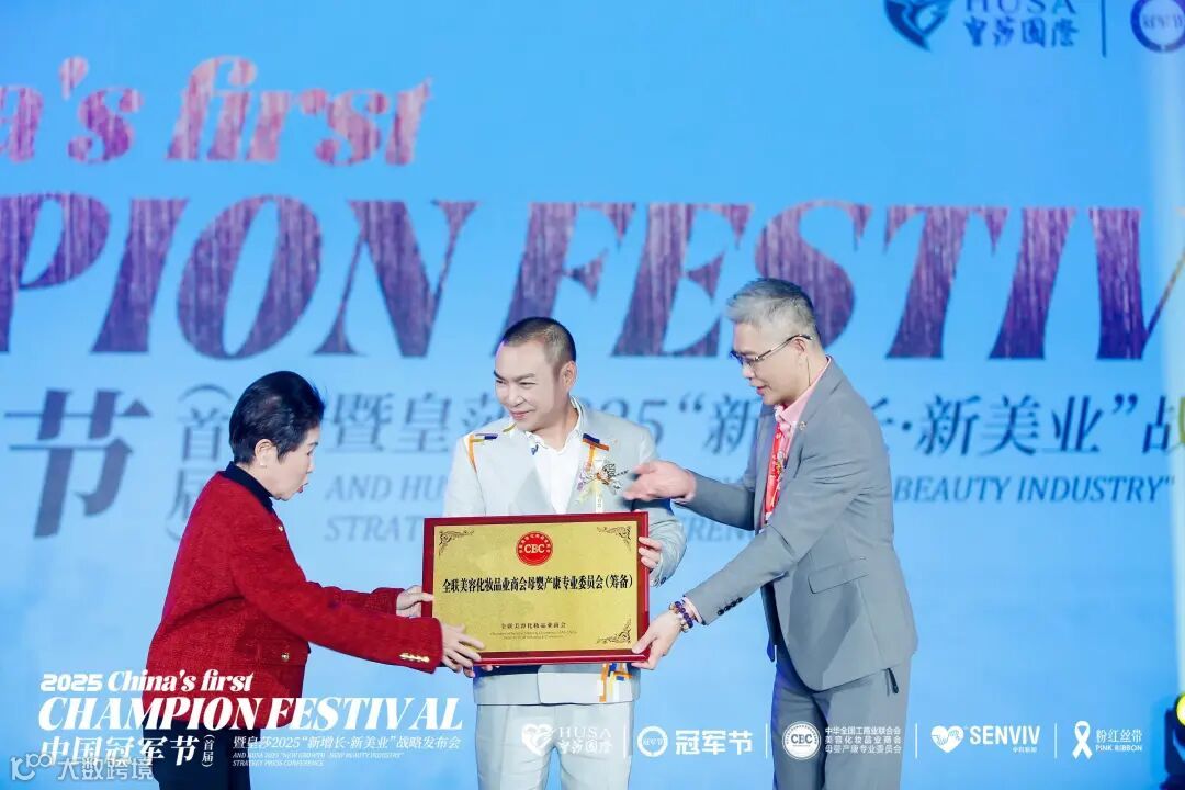 中国国际美博会创始人/全国工商联美容化妆品业商会名誉会长——马娅女士亲自上台进行授牌: