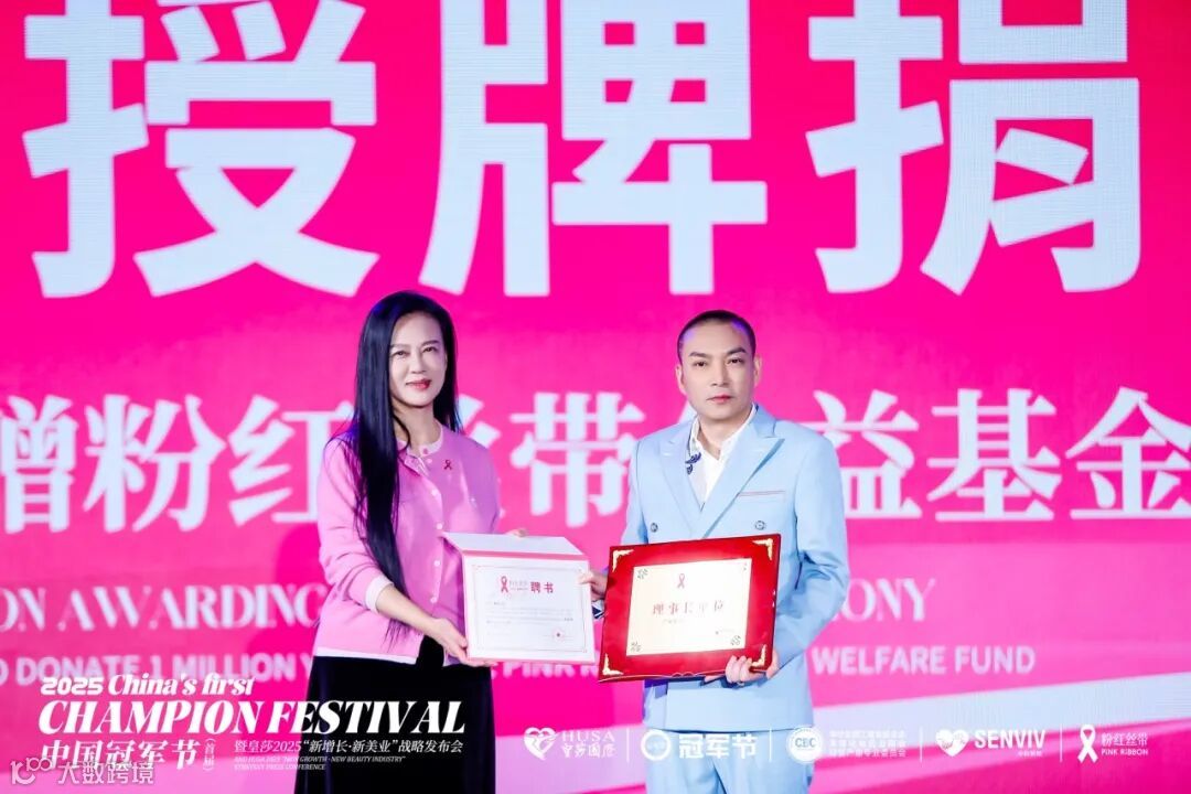 粉红丝带公益秘书长吴虹萱亲自授牌,授予皇莎集团“粉红丝带荣誉理事长单位”,授予皇莎集团董事长陶伟“粉红丝带荣誉理事长”。