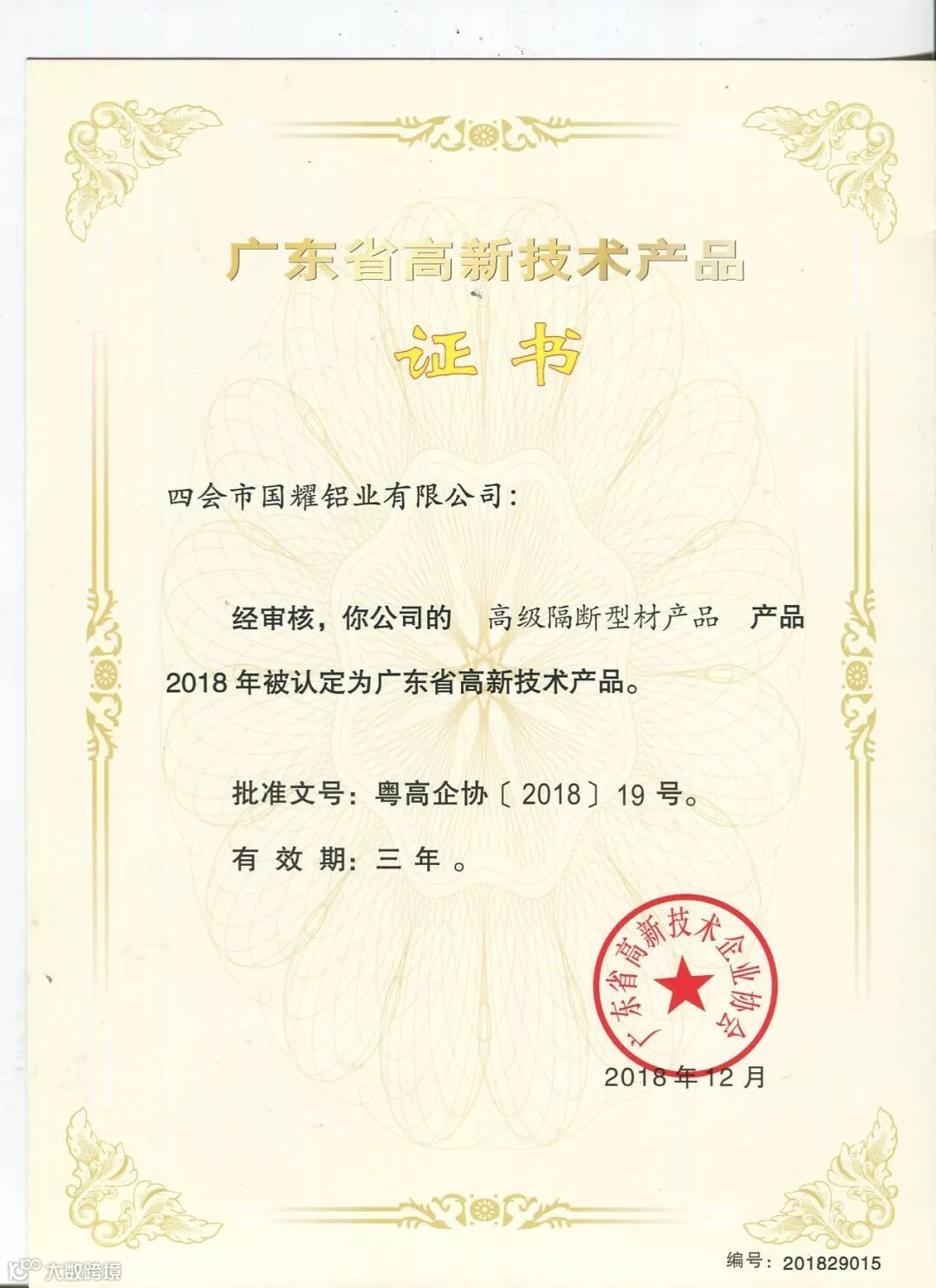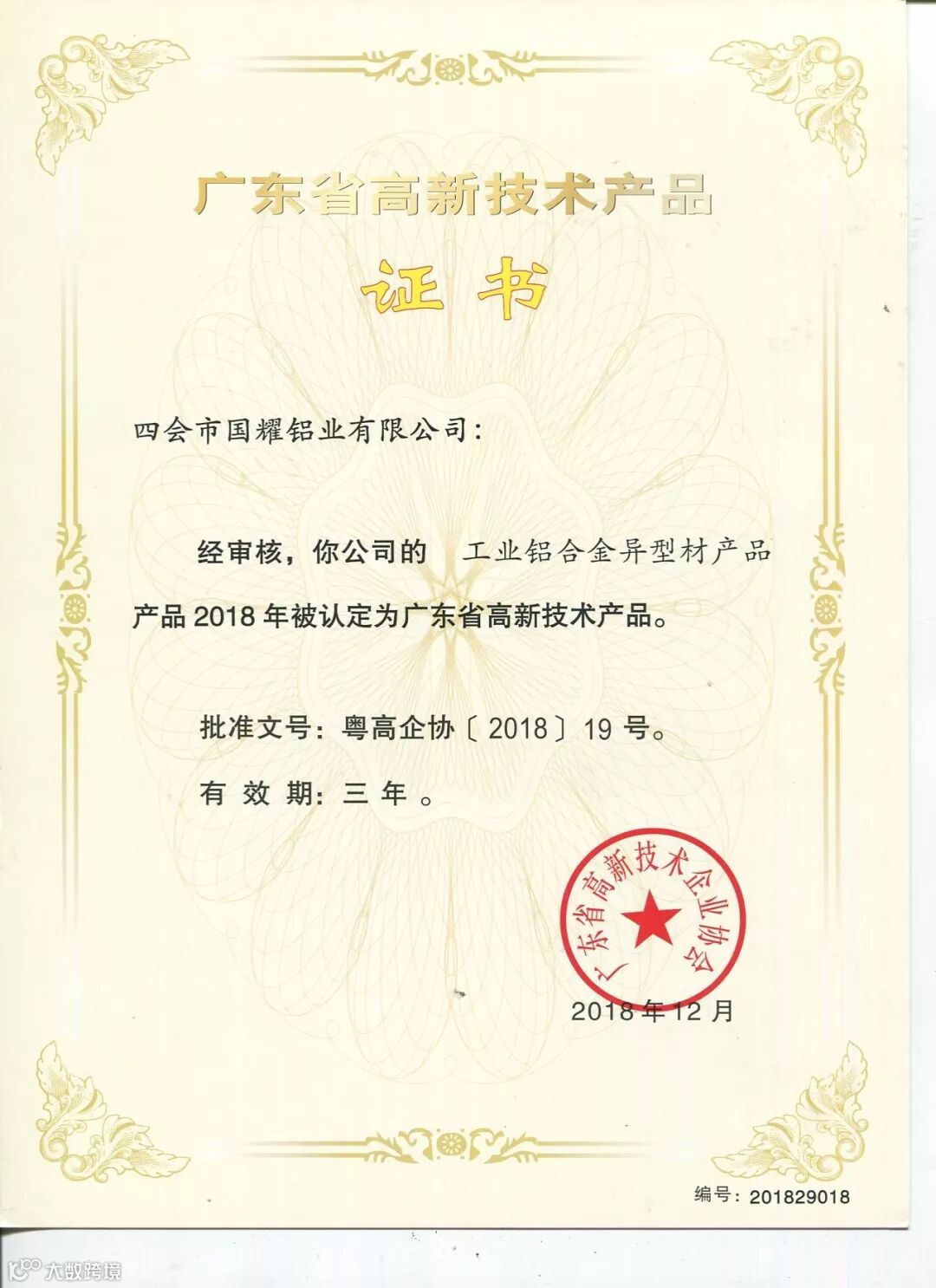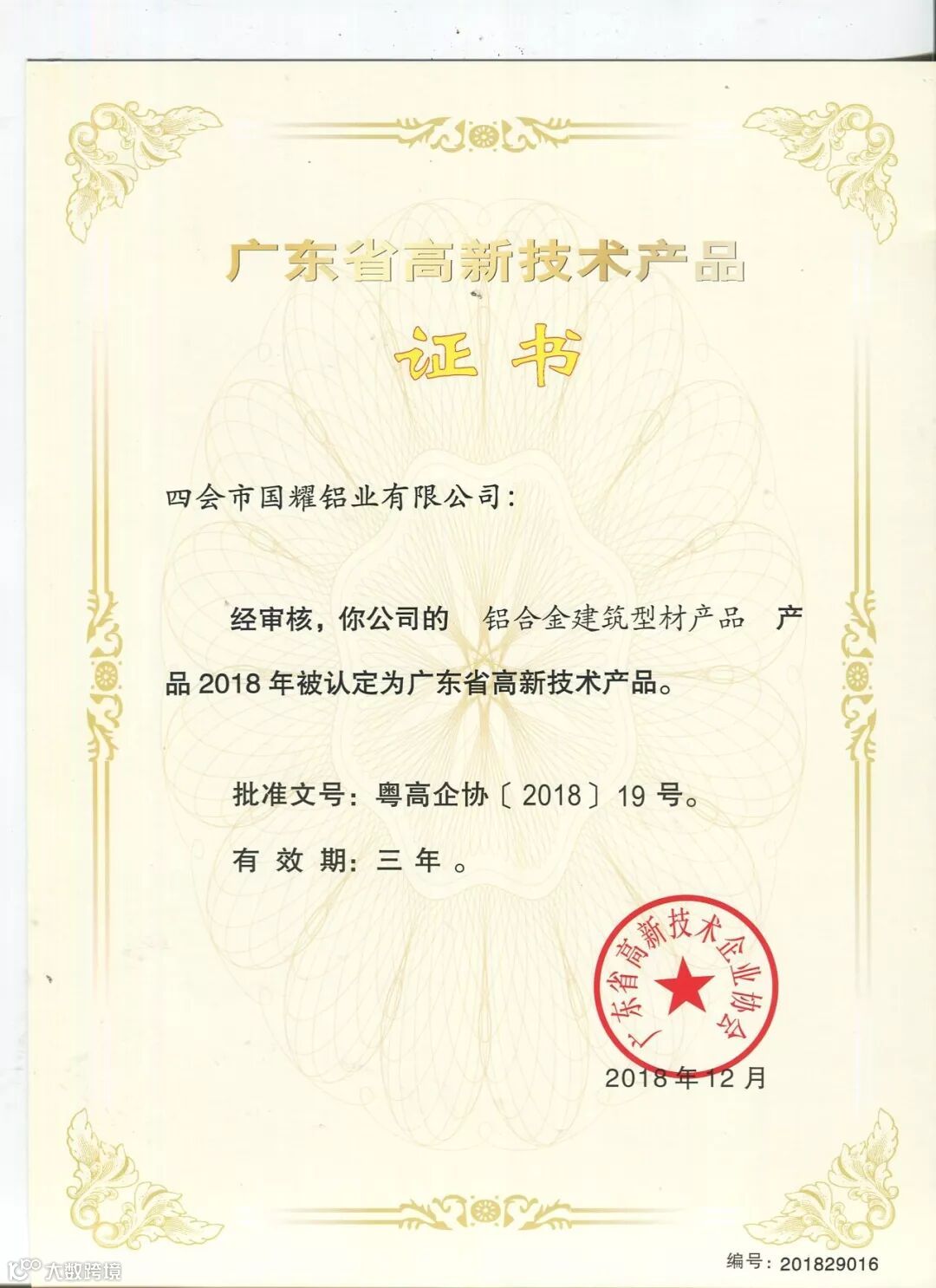 在公司的高度重视,各部门齐心协力下,由国耀铝业生产的工业铝合金异型材产品 、便携式铝材幕墙 、铝合金建筑型材产品 、新型防盗易安装铝合金窗 、高级隔断型材产品 、喷砂铝合金纱窗、可伸缩铝合金围栏 被认定为广东省高新技术产品。