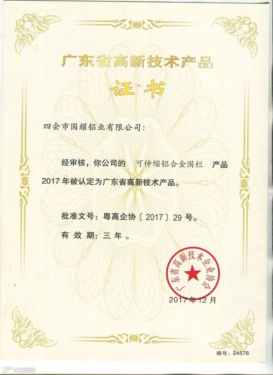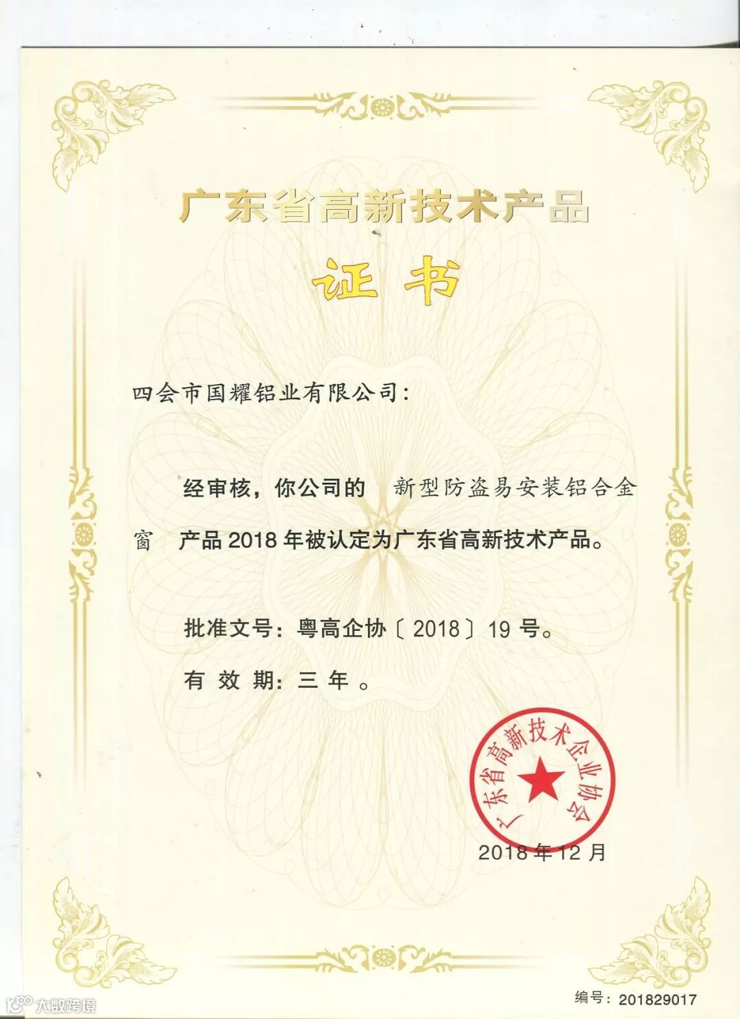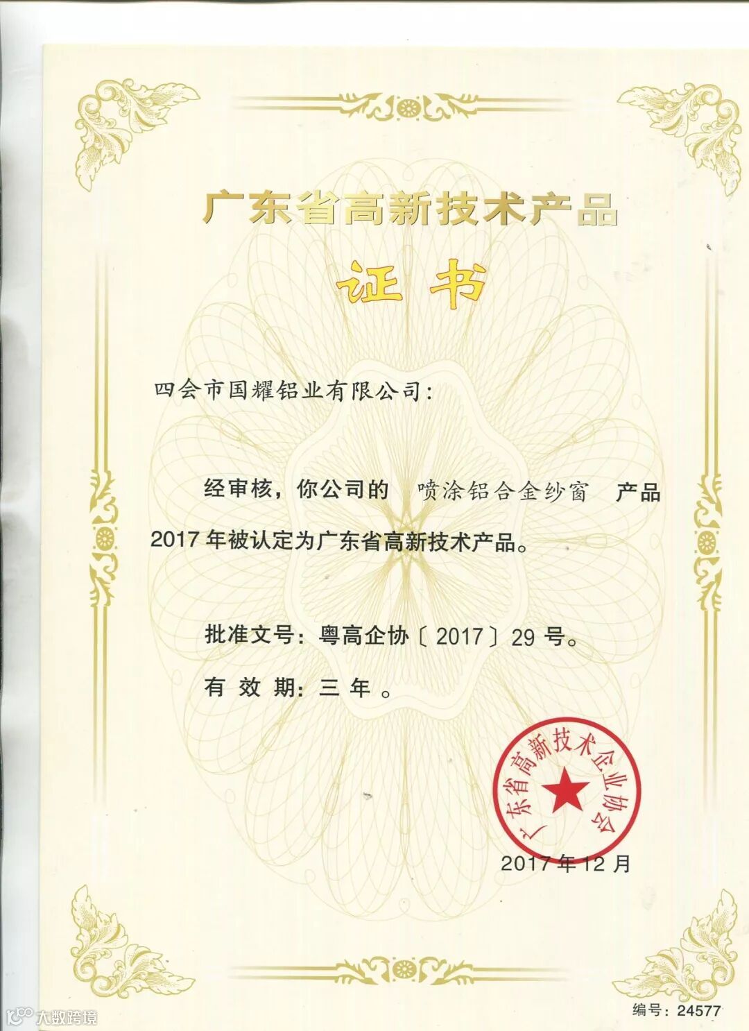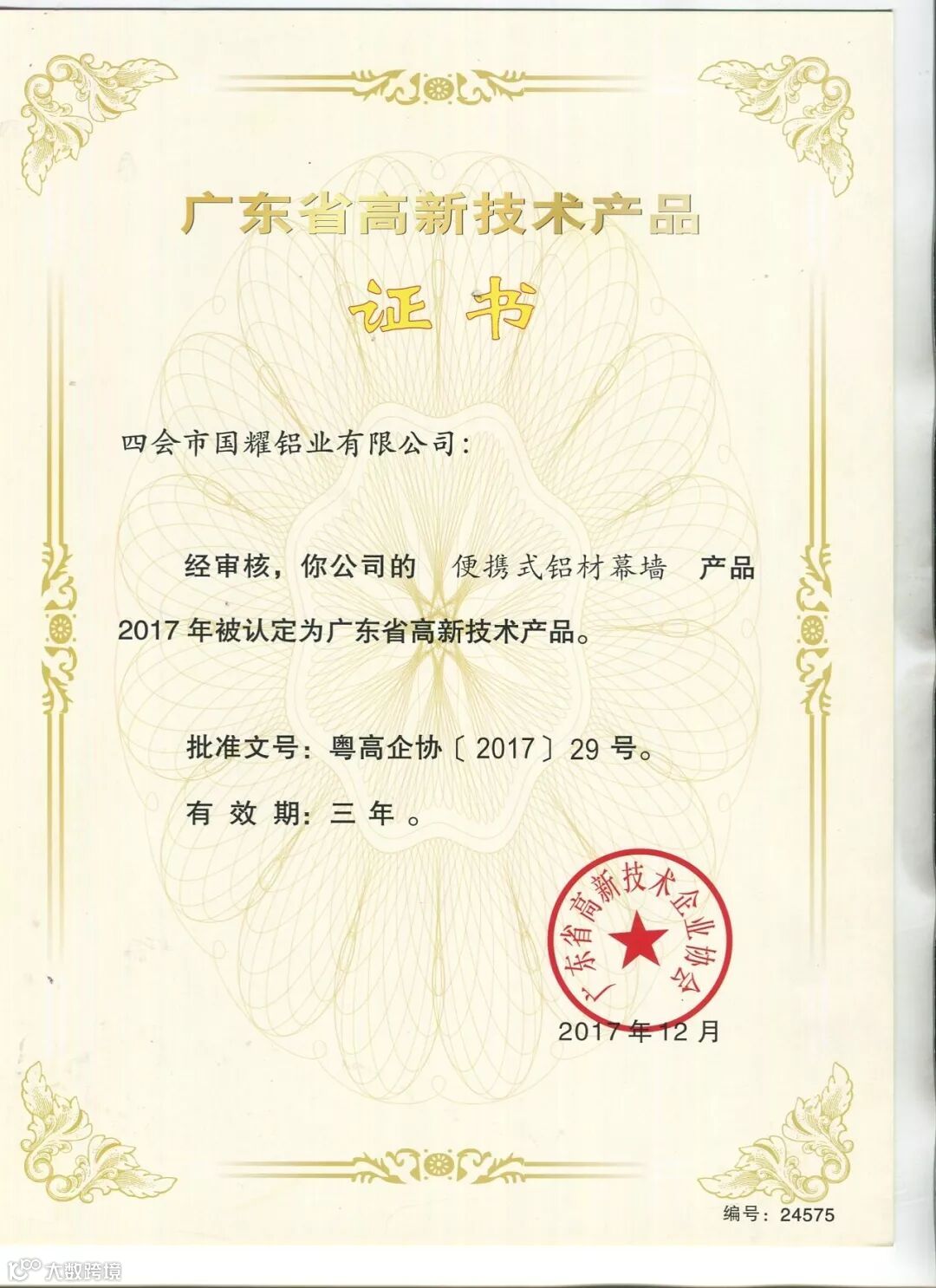 在公司的高度重视,各部门齐心协力下,由国耀铝业生产的工业铝合金异型材产品 、便携式铝材幕墙 、铝合金建筑型材产品 、新型防盗易安装铝合金窗 、高级隔断型材产品 、喷砂铝合金纱窗、可伸缩铝合金围栏 被认定为广东省高新技术产品。