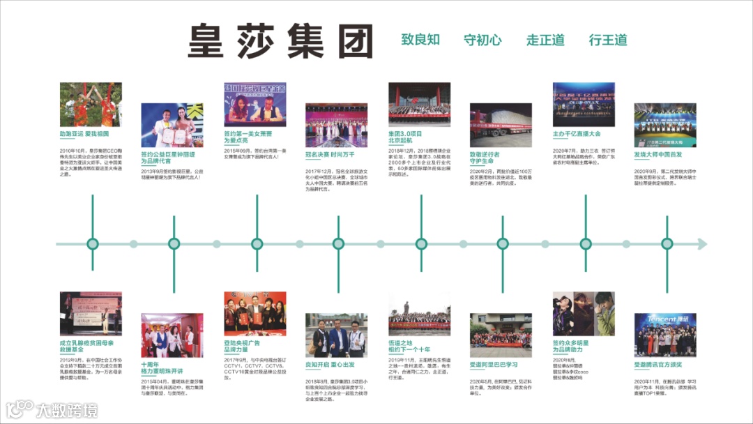皇莎集团是敢于人先的企业,申请成立中科乳房研究院,为攻克女性胸部健康问题作专项研究及科研实践应用;签约中央电视台CCTV-1 、CCTV-7 、CCTV-9 ,CCTV-10等投放乳房公益广告;战略联盟百年品牌二天堂制药集团为产品注入专业技术;向雁栖湖企业家大会递交企业3.0战略,并在4000多家各行业领袖/上市企业的大会上得到展示;首个发起美业千亿直播大会,荣获政府颁发的三农公益爱心企业、恒大直播基地联盟企业,广东省农村电商副主席单位;
