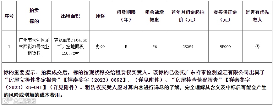 五、上述标的《租赁权拍卖标的情况及特别说明》、《物业租赁合同书(样本)》及《拍卖规则和注意事项》等拍卖资料请各竞买人登录交易平台详细查看本公告附件内容。