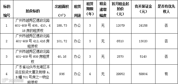 五、上述标的《广州市越秀区德政北路401-409号408、410、418房等4项物业租赁权拍卖标的情况及特别说明》、《广州市房屋租赁合同(模板)》/汕头项目的《租赁合同(模版)》及《拍卖规则和注意事项》等拍卖资料请各竞买人登录交易平台详细查看本公告附件内容。