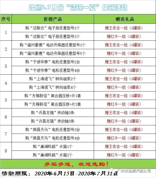导读:广州市路顺汽车配件有限公司联合众多配件品牌,在6月15日至7月31日期间进行了一场“清凉一夏”促销活动,为大家和汽车降降温!