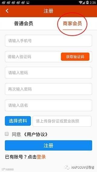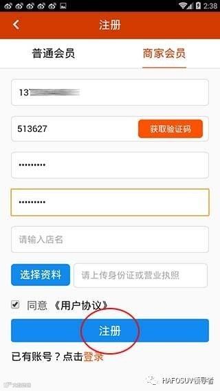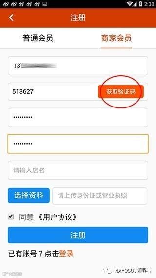 【第四步】依次输入手机号码、两次密码、您的店名,并把“同意用户协议”勾上,点击“获取验证码”
