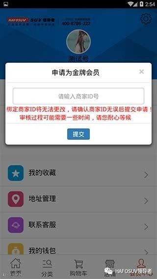 【第二步】在浮动窗口输入“商家ID号”,然后按提交,等待商家审核即可升级成为金牌会员。