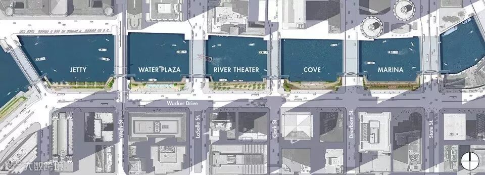 二、三期的任务是改造州街与湖街之间的六个街区,芝加哥河上的桥成为街区的边界,每个街区有各自的特点和风景。