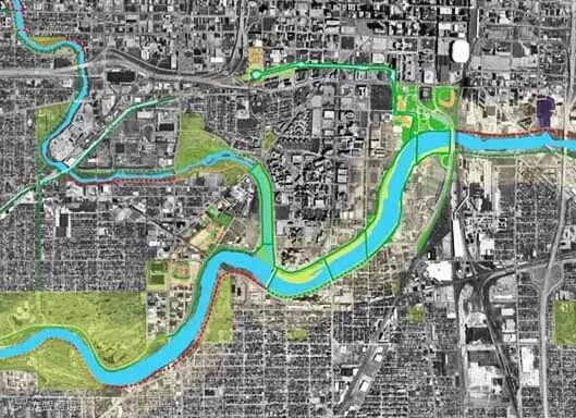 滨河公园起了催化剂的作用。公园建设使得土地价格升值,从而吸引更多的 开发计划。将城市中的不同机构和设施与公园和河流重 新联系在一起,形成了新的结构关系。