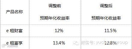 按照e租宝官网公布的内容,自 2015年11月1日0:00起,平台对e租财富和e租富享两款投资产品的预期年化收益率进行下调,其中e租财富由12%降至11.5%;e租富享由13.4%降至12.8%。这次调整不会影响11月1日零点前发布的融资租赁债权转让项目。