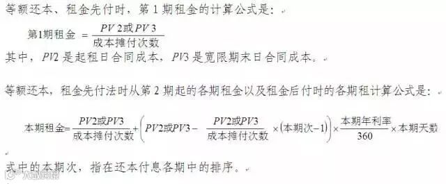 列入购置成本的项目通常不止一个,它们各有其不同的发生日。即使只有一个项目,一个发生日,如开证日,这个发生日也不会同约定的起租日自然重合。这就使得这些项目的数额不能直接代入租金公式。租金公式中的PV,即现值或本金,只能是在某个确定的作为起租日的日期的租赁物件购置成本。(这里不谈只有一笔汇付并且以汇付日为起租日的特例)。因此,为了确定租金中的PV,必须首先分别求出这些项目的符合合同约定条件(何日起息或折现以及计息利率或折现率的取值条件)的至起租日的本利和或折现值,然后求其总和。如果合同约定有宽限期,而且宽限期末日不付息,则代入租金公式中的PV的,将是算到宽限期末日的购置成本。