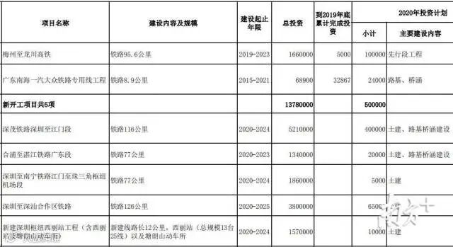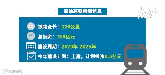 根据省发改委公布的《广东省2020年重点建设项目计划表》,深圳至深汕合作区铁路被列入今年新开工项目,铁路长126公里,总投资为380亿元。今年将进行土建,年度计划投资6.5亿元。