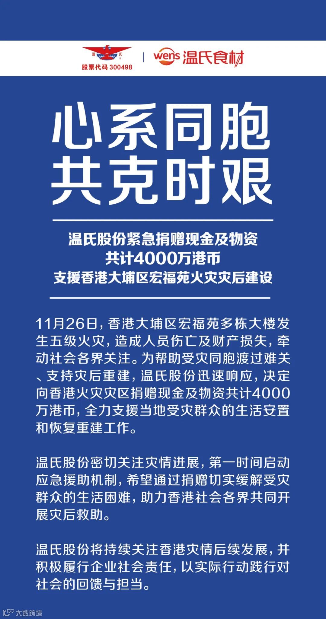 温氏股份紧急捐赠现金及物资共计4000万港币,支援香港大埔区火灾灾后建设