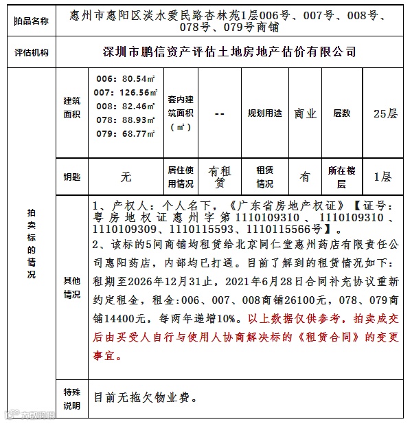一、惠州市惠阳区淡水爱民路杏林苑1层006-008、078、079号商铺