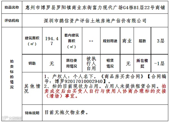 特别提醒:拍卖标的交易及过户按拍卖标的所在地有关房地产限购政策执行,竞买人须自行向拍卖标的所在地房地产登记管理部门查询确认自己的购买资格及过户的相关政策,过户风险自行承担。如竞买人不符合现行规定的,由竞买人自行承担由此产生的如竞买无效或无法办理房地产权属转移登记等相关法律责任。港澳台及外国人士须符合相关房地产政策规定。