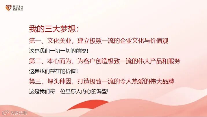 围绕三大梦想,第一项就是文化美业,建立极致一流的企业文化与价值观。企业的文化与价值观,是我们一切一切商业行为的发心与前提!因此2024,我们要进一步深耕文化。