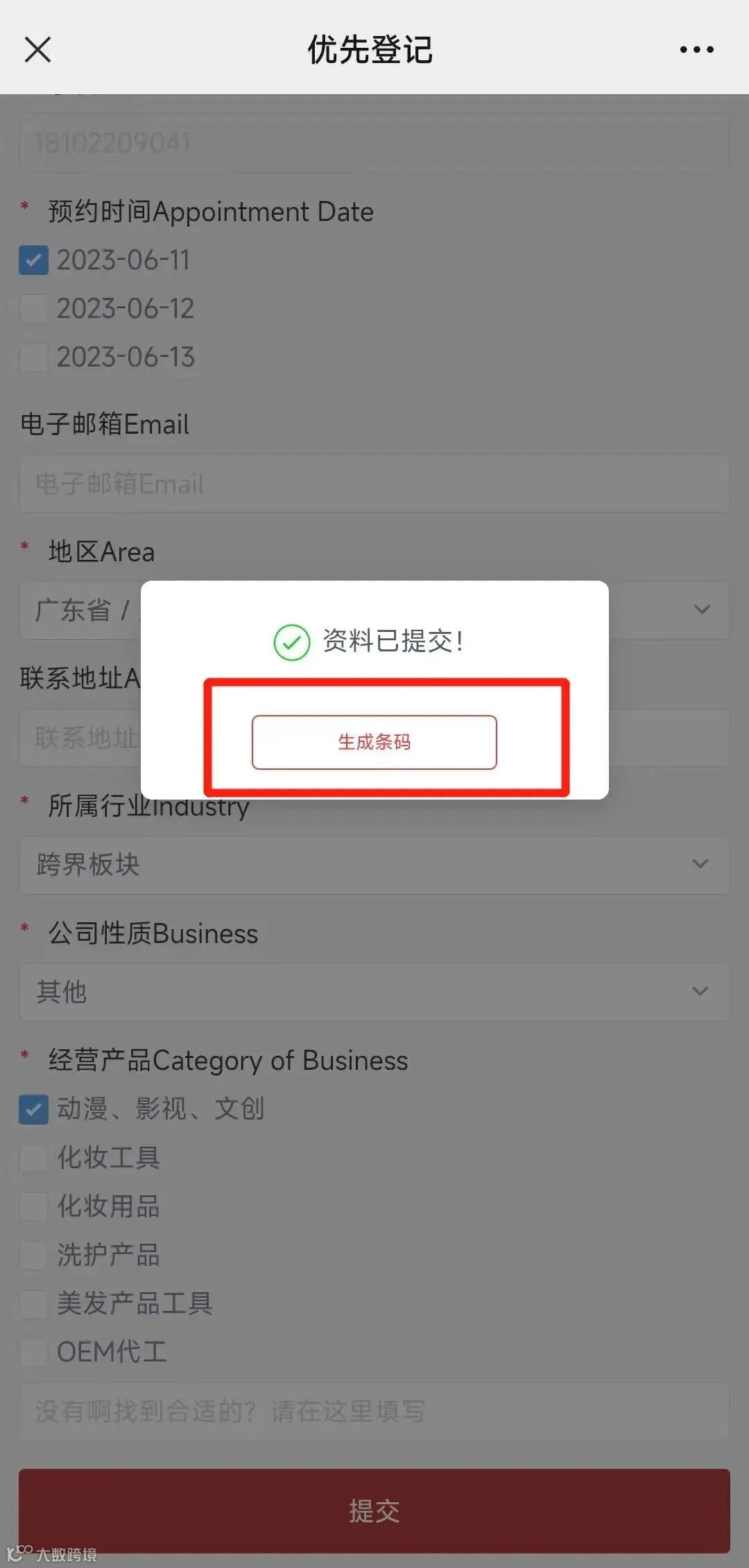 02.提交资料,点击“生成条码”