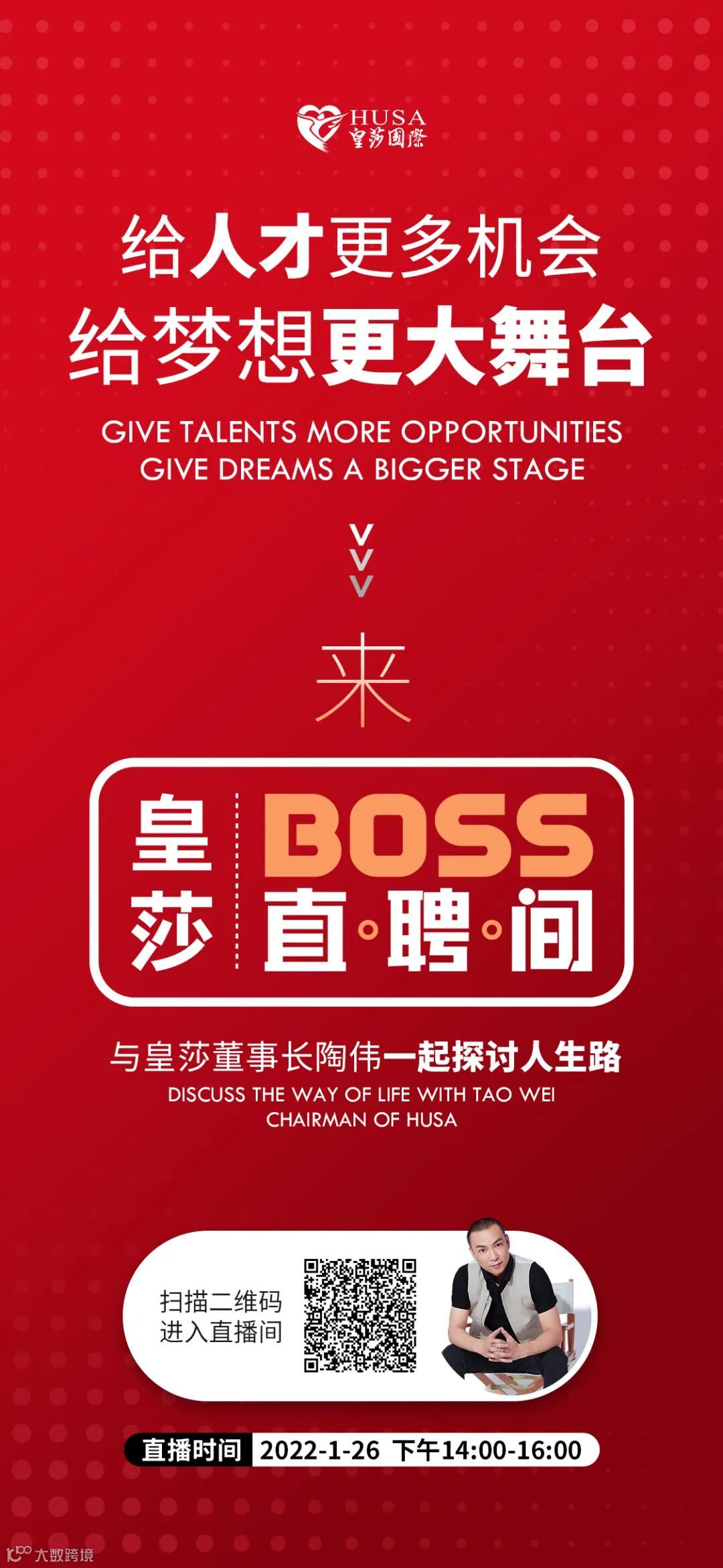 记得罗振宇在跨年演讲“时间的朋友”中讲到“企业要为员工的生存能力负责”。能为员工负责,首先必须是一家好公司。罗胖说,一个好公司的样子应该是从上到下,充满活力,不断地吸引人、发展人,让每一个员工充满主动的探索精神。2022,我们笃定相信皇莎美好未来,笃定皇莎人可以再次创造2021年2.5倍以上的战果,因为“打胜仗”的精神永远在皇莎,创新致善,微笑前行,我们需要更多的同行者,一起参与见证信念与奇迹的2022,所以需要所有皇莎家人一起来感召更多美业朋友、同学、闺蜜、哪怕陌生人进来皇莎,一起共创皇莎辉煌2022,500位皇莎人,每人感召一位,就变1000人,每人两位,就成1500人,荣誉和幸福需要分享,行业需要领袖、引领者,1月26日,皇莎BOSS直聘直播间,我们一起行动起来,让身边更多的人一起进直播间,来感受皇莎力量、皇莎信仰!