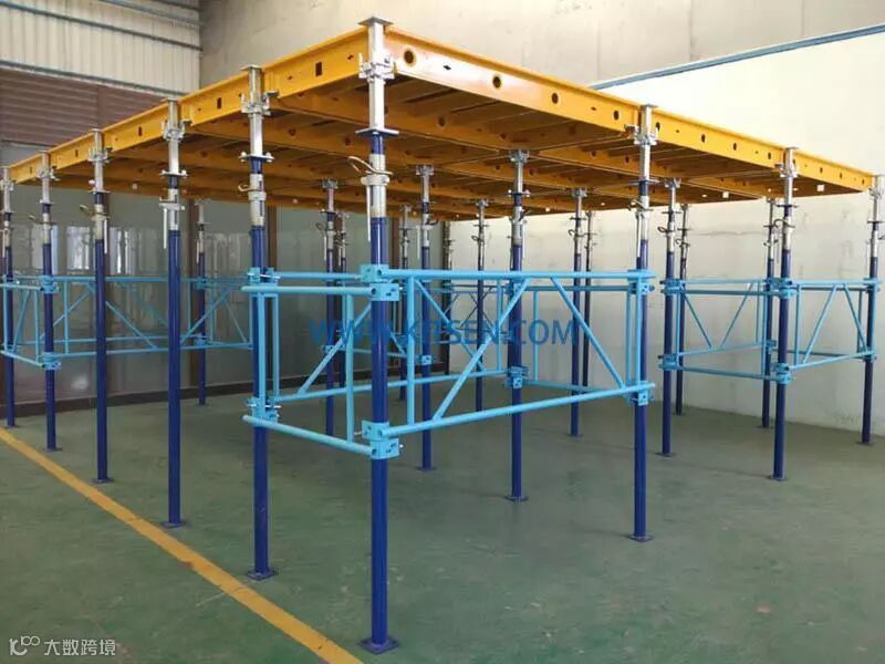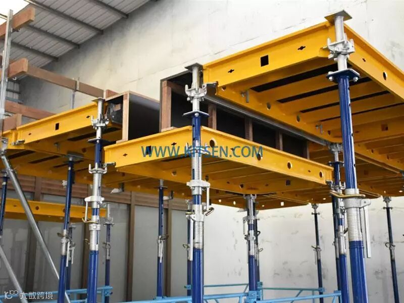 5、应按照模板方案要求搭设支模架,并在搭设完毕后检查支托标高及起拱高度,且应保证板模板齐平地铺到梁侧模外口,不得铺在梁侧模上面。