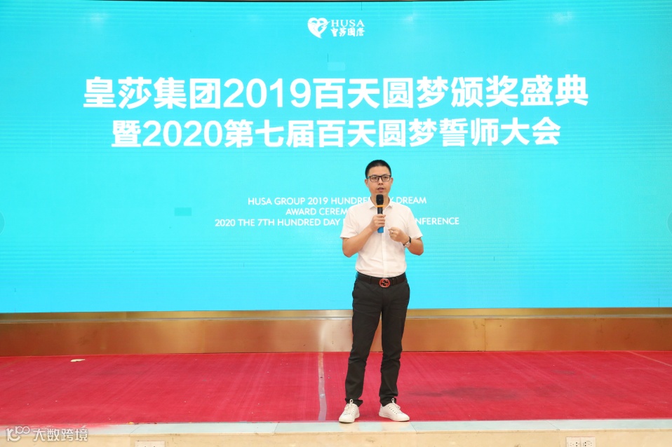 皇莎集团董事长陶伟先生为本次誓师大会致开场辞,一席真挚而激情的讲话点燃了会场气氛。他以获奖精英为标杆对全体皇莎人提出期望,重点对2020年百日圆梦进行了布局与动员,指明方向,统一思想。